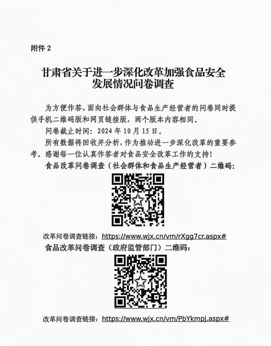 ?????根據張掖市食品安全委員會辦公室關于做好第三方評估工作的補充通知要求,現將甘肅省關于進一步深化改革加強食品安全發展情況問卷調查發布網站,請系統內黨員干部積極參與。