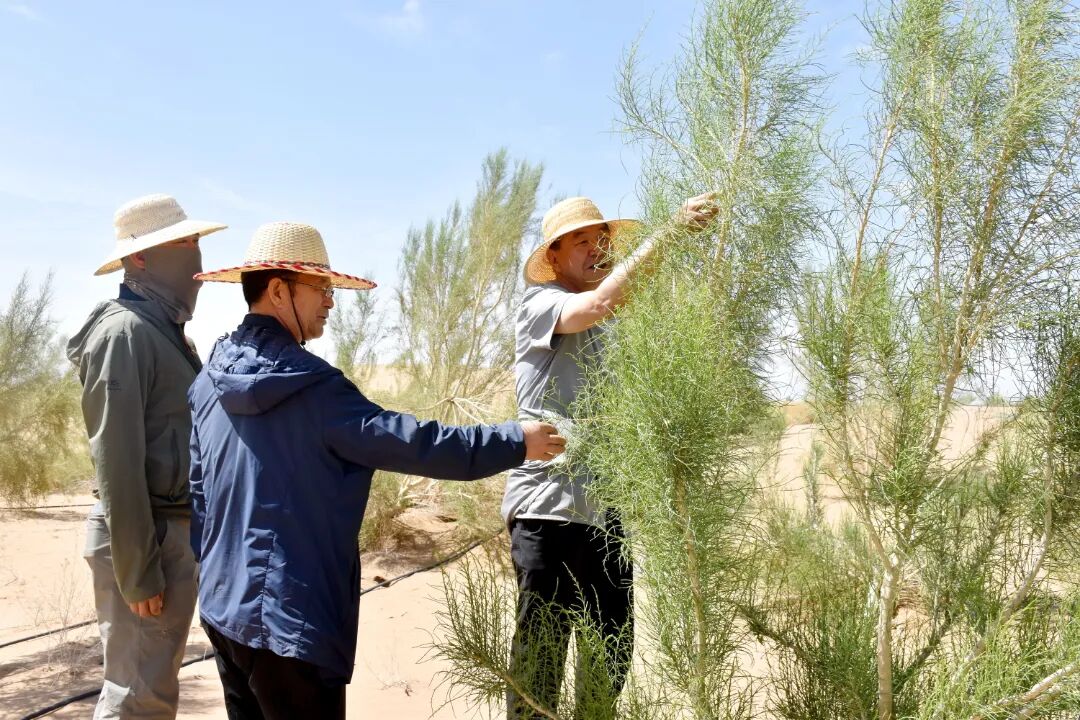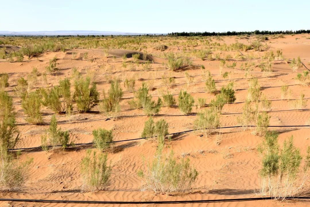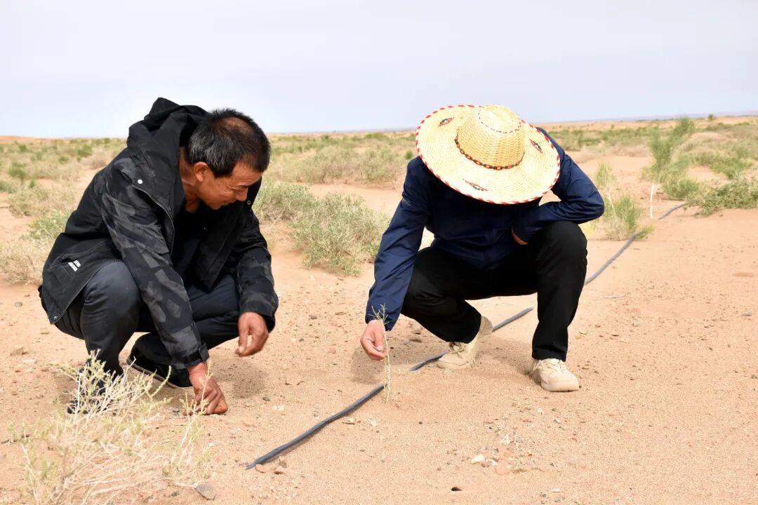 在荒漠戈壁中種活一棵樹,絕非易事。十年耕耘見證了這里的生態(tài)治理之變。“過去用水車拉水漫灌,沙地里的水分還沒滲下去就被曬干了。”縣治沙站技術人員陳輝感慨道。而今,鋪設滴灌管網(wǎng)、采用“淺埋滴灌”模式編織起的“水網(wǎng)”,讓肆虐的風沙著實收斂了腳步。