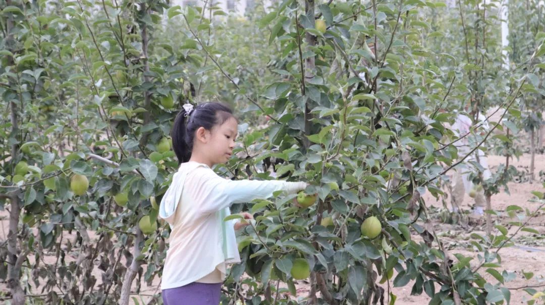 隨后,孩子們來到杏、梨種質(zhì)資源圃。科研人員向孩子們講解了種質(zhì)資源圃的重要作用:“這里就像是果樹的‘圖書館’,收集保存了數(shù)百個(gè)品種,為我們選育優(yōu)良新品種提供寶貴材料。”孩子們仔細(xì)觀察不同品種的形態(tài)特征,認(rèn)真聆聽專家講解果樹從開花到結(jié)果的完整過程。技術(shù)人員特別介紹了果樹生長過程中面臨的各種挑戰(zhàn):“早春的霜凍可能讓花朵凋零,夏季的病蟲害需要及時(shí)防治,每一個(gè)果實(shí)的成熟都凝聚著科研人員和果農(nóng)的辛勤汗水。”孩子們聽后紛紛表示,原來吃到香甜的水果需要經(jīng)歷這么多不容易。在梨測(cè)試評(píng)價(jià)區(qū),早酥梨壓彎了枝條,正值最佳采摘期,科研人員向孩子們演示了如何判斷梨的成熟度和正確的采摘方法:“要用手托住果實(shí),輕輕向上掰,不要硬拽。”孩子們小心地采摘著成熟的梨子,臉上洋溢著收獲的喜悅。