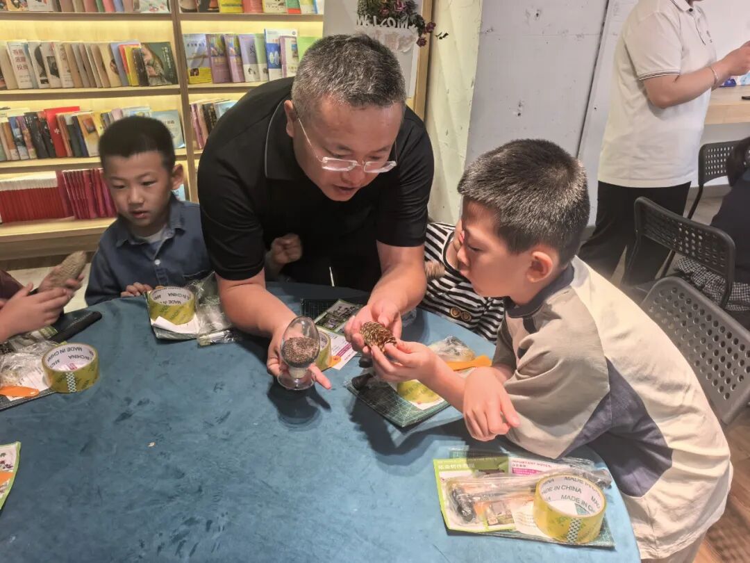 講解員以“松果種子如何乘風(fēng)而行”“種子如何吸水膨脹”等互動實驗,引導(dǎo)孩子們觀察植物生命的奧秘。孩子們通過吹動球果種子、觸摸吸水種子,直觀感受植物生長的奇妙過程。
