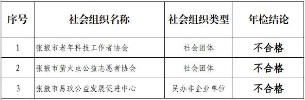 ? ???根據《社會團體登記管理條例》《民辦非企業單位登記管理暫行條例》《民辦非企業單位年度檢查辦法》等法規、規章及有關規范性文件的規定,對張掖市民政局成立登記的社會團體、民辦非企業單位實施2024年度檢查。經初步審查,現對社會組織2024年度年檢擬定結論予以公示,公示期為7天(2025年9月18日—9月25日),公示期內若對年檢結論有異議的請向張掖市民政局社會組織管理局舉報或反映。