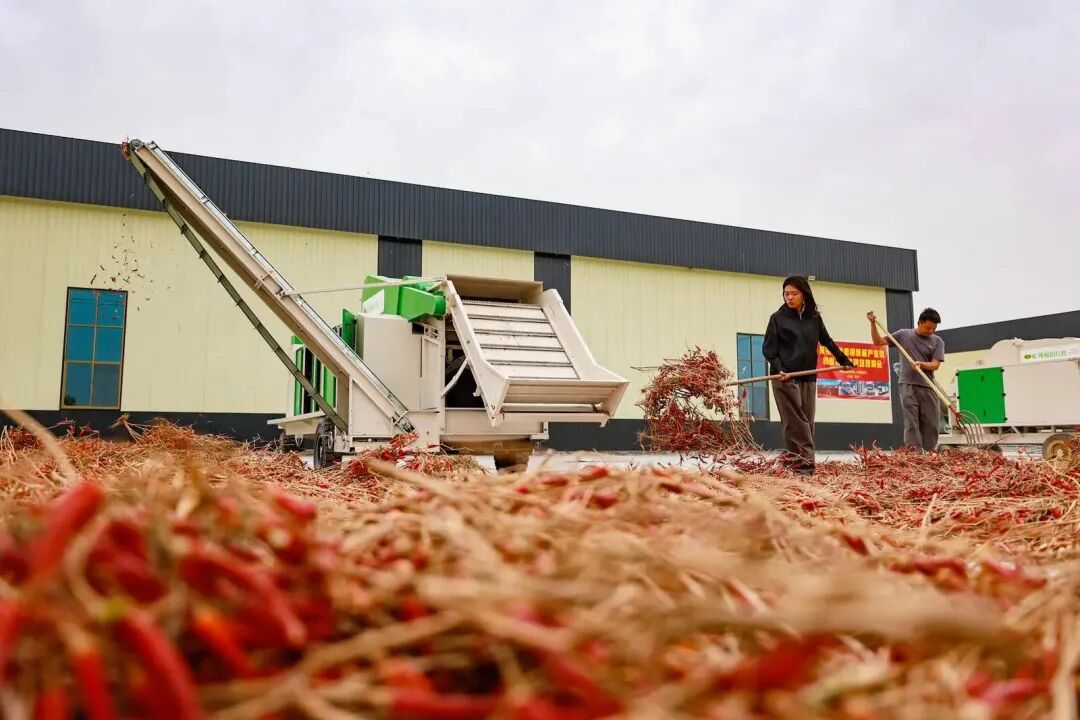 走進高臺西部辣椒產業園,辣椒除柄機、高辣朝天椒去把機等專業化農業機械應有盡有。工人們將一堆堆完全曬干的紅辣椒傾倒在辣椒拍打機的進料口,干硬、皺縮的辣椒如同紅色的雨點,瞬間被旋轉的滾軸卷入、吞沒。隨著機器內部傳來持續而清脆的“噼啪”聲,被拍打過的辣椒從下方的出料口如細流般涌出,辣椒和果柄已然涇渭分明。
