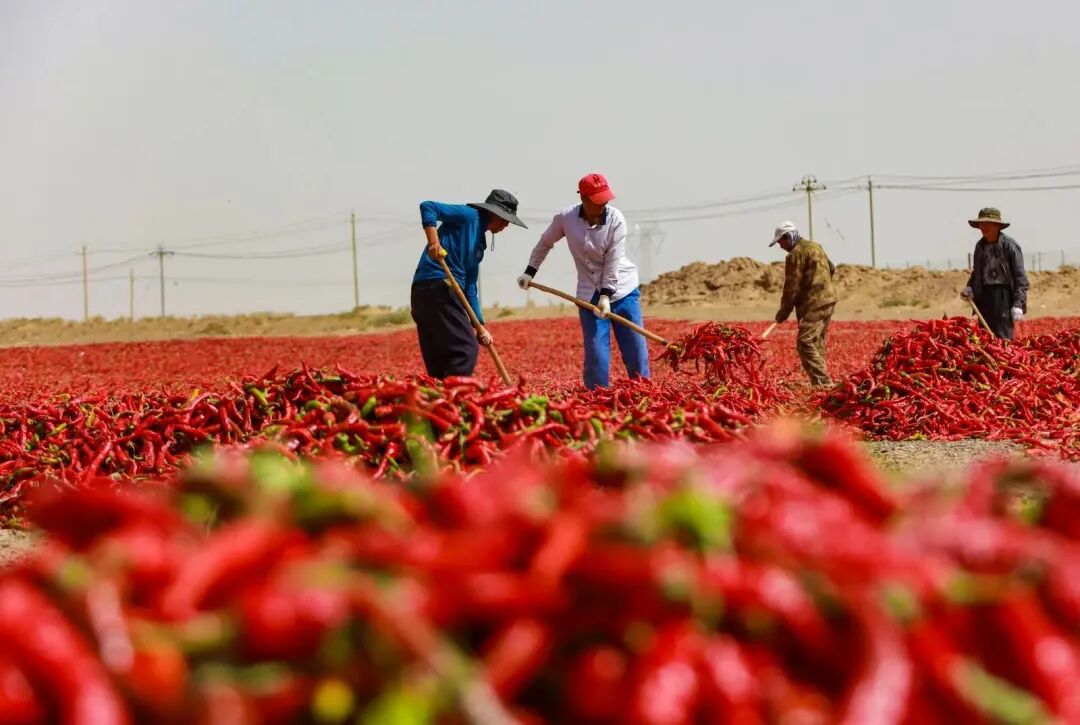 來到高臺縣黑泉鎮胭脂堡村,村民們正忙碌地穿梭于田壟之間,熟練地將一個個飽滿紅亮的辣椒采摘入筐,田間地頭洋溢著歡聲笑語。不遠處的晾曬場上,工人們正彎腰將新收的辣椒均勻鋪開,在陽光的照耀下宛如一片“紅色海洋”,映照著又一個豐收年景。