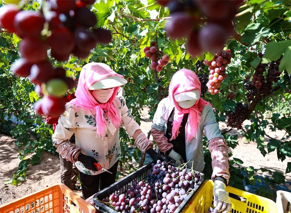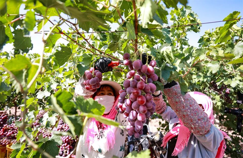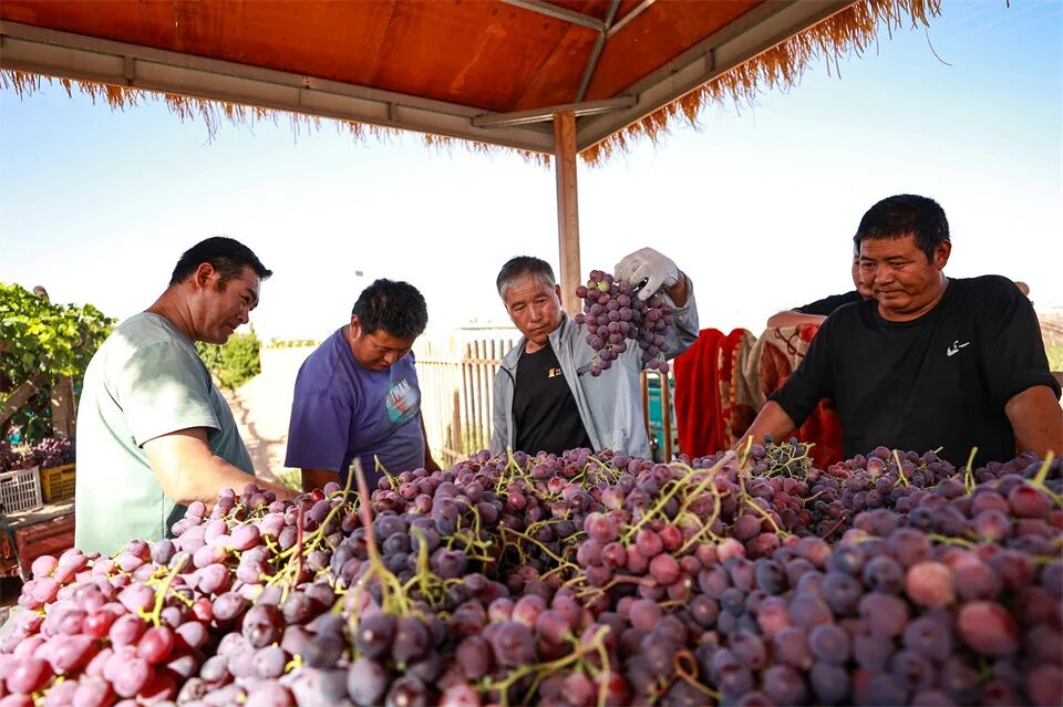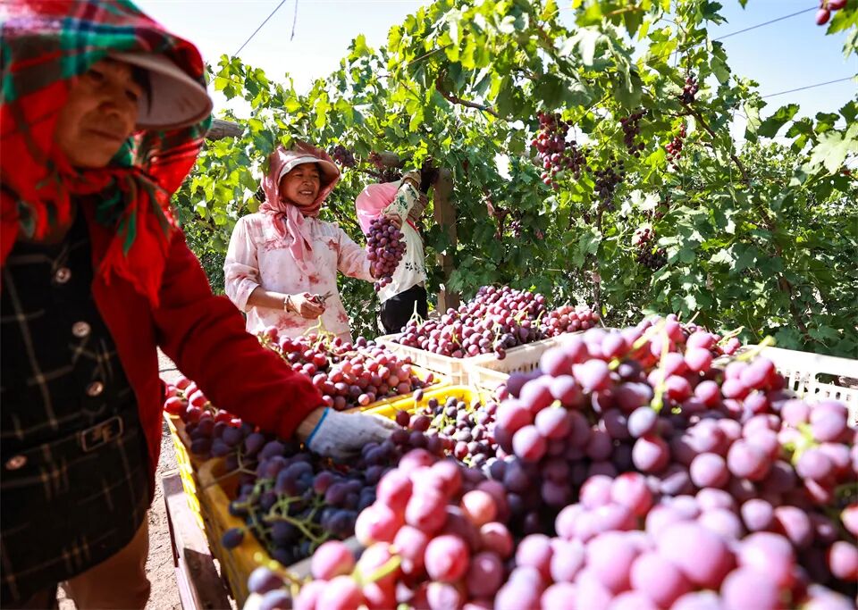 9月8日,張掖市臨澤縣平川鎮三二村的農戶們正在采摘已經成熟的葡萄,一串串顆粒飽滿的葡萄掛滿枝頭,在陽光的照耀下,晶瑩剔透。農戶將采摘下來的葡萄篩選、裝車,準備發往甘肅、新疆等地。
