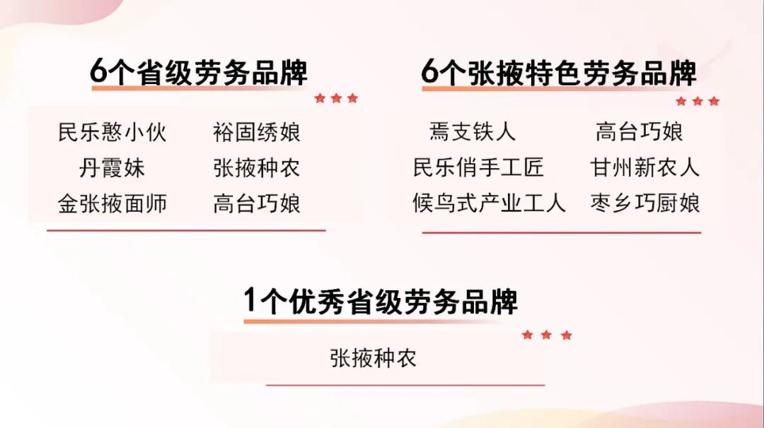 在近日舉辦的勞務品牌工作省級選拔賽中,我市集中展示了以“四+”舉措凝聚“四力”,成功創建6個省級勞務品牌、1個優秀省級勞務品牌、6個張掖特色勞務品牌,年帶動就業超13萬人的顯著成果。