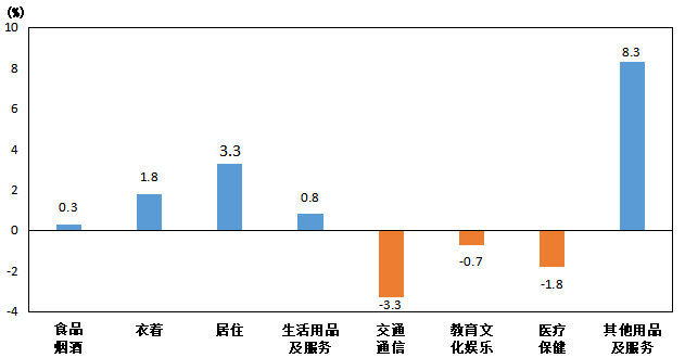 其他七大類價格同比“四漲三降”。其中,其他用品及服務類價格上漲8.3%,居住類價格上漲3.3%,衣著類價格上漲1.8%,生活用品及服務類價格上漲0.8%;交通通信類價格下降3.3%,醫療保健類價格下降1.8%,教育文化娛樂類價格下降0.7%。