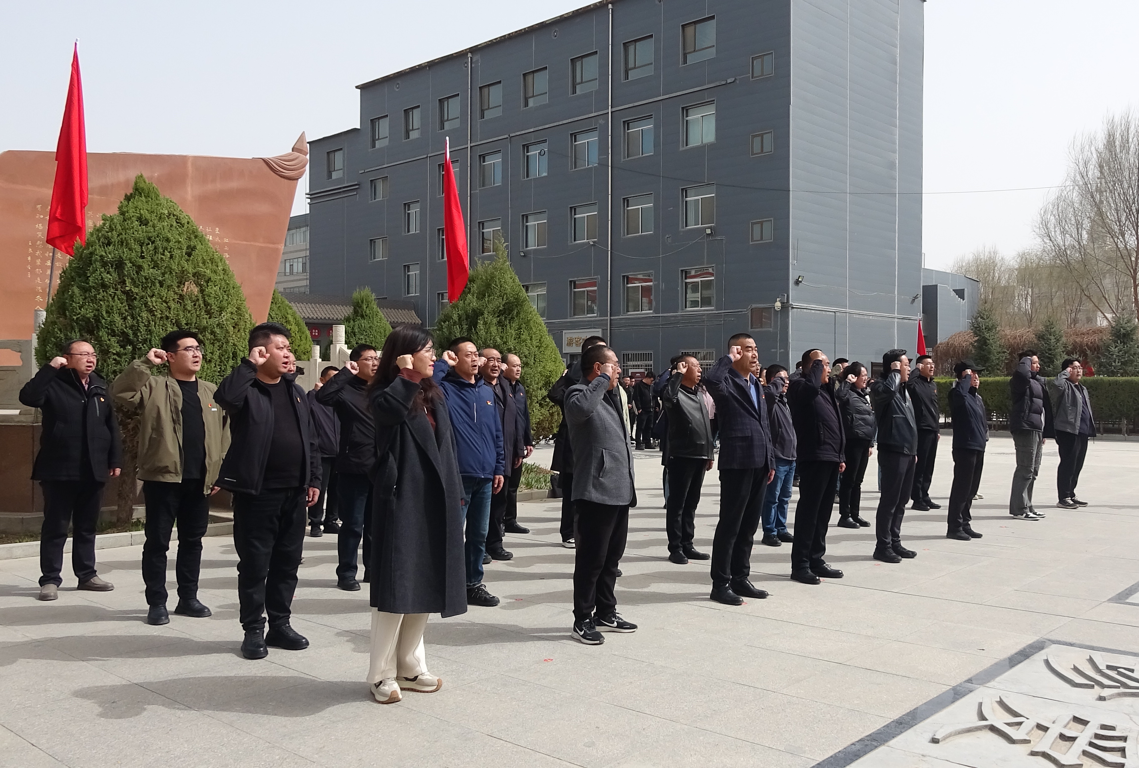 全體黨員干部整齊列隊,激昂的國歌聲回蕩在紀念館的上空,仿佛在訴說著先烈們為國家獨立、民族解放而進行的英勇斗爭。兩名黨員干部莊重地抬起花籃,邁著沉穩有力的步伐走向烈士雕像,將花籃穩穩安放?;ɑ@上的紅色緞帶隨風飄動,象征著革命先烈用鮮血鑄就的不朽旗幟。局領導神情肅穆,仔細整理花籃挽聯,全體黨員干部向烈士雕像深深鞠躬默哀,寄托無限哀思。默哀時刻,現場一片寂靜,微風輕拂,似乎是先烈們的英魂在與大家對話,傳遞著堅守理想、無畏犧牲的精神力量。