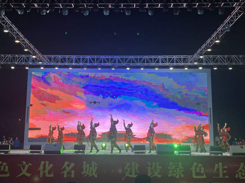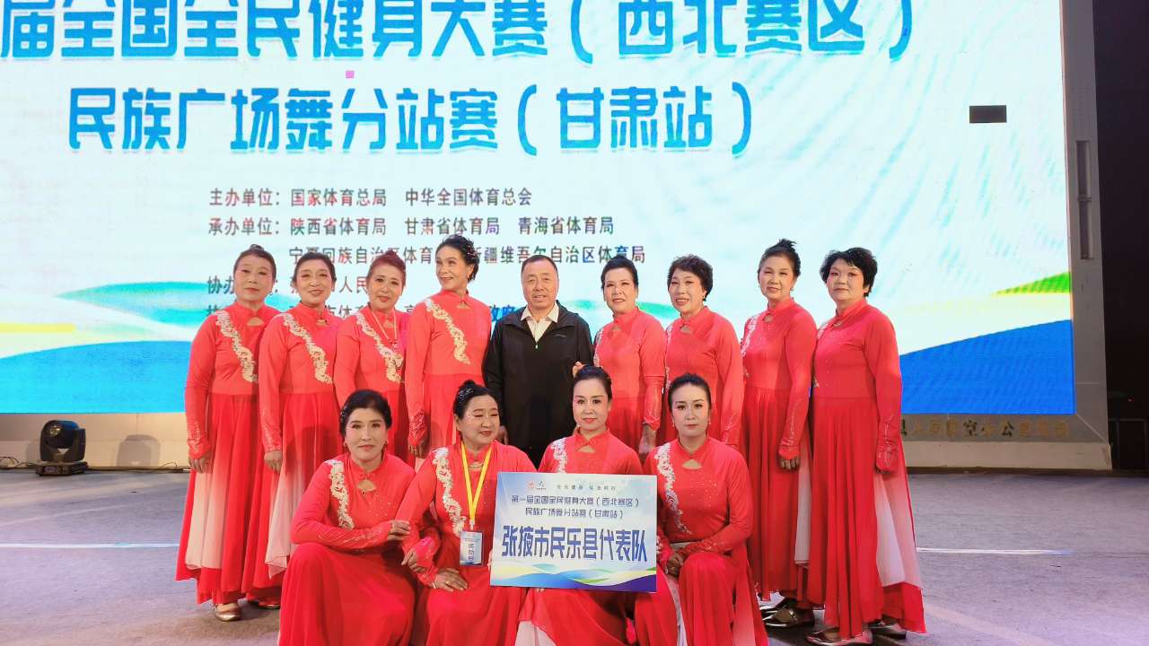 民樂縣代表隊在第一屆全國全民健身大賽(西北賽區)民族廣場舞比賽(甘肅站)比賽的舞臺上亮相
