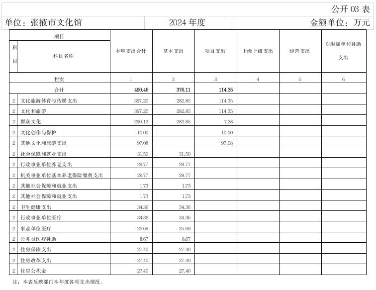 2024年度一般公共預(yù)算財政撥款支出490.46萬元,文化旅游體育與傳媒支出397.20萬元,占80.98%;社會保障和就業(yè)支出31.50萬元,占6.42%;衛(wèi)生健康支出34.36萬元,占7.01%;住房保障支出27.40萬元,占5.59%。