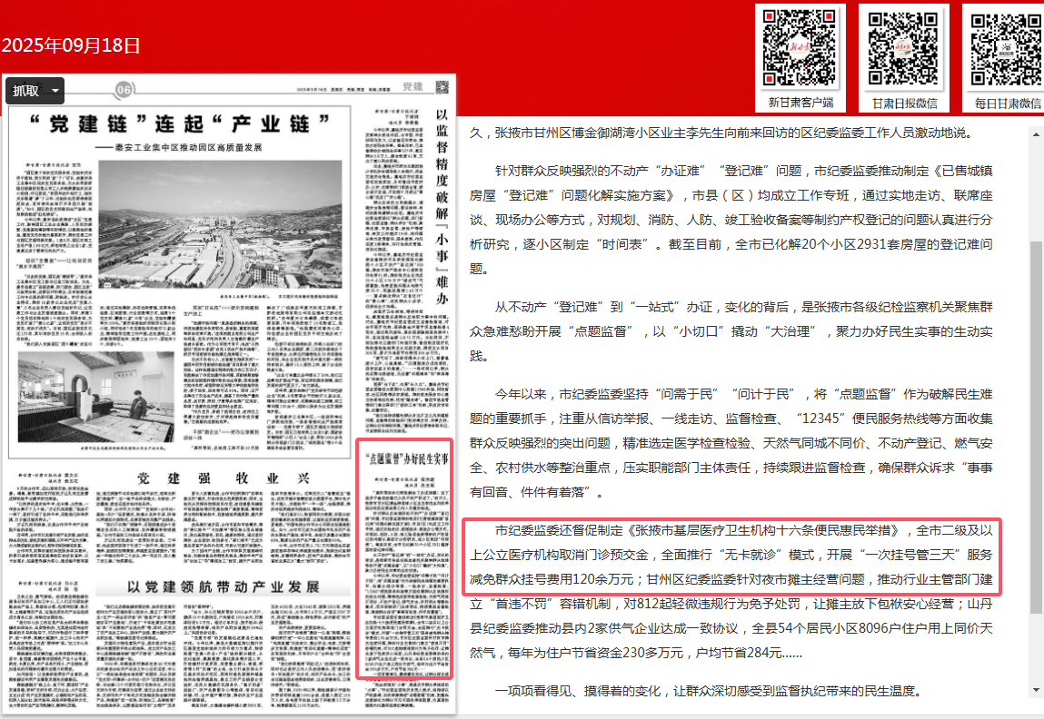 近日,《甘肅日報(bào)》黨建版在《“點(diǎn)題監(jiān)督”辦好民生實(shí)事》一文中,報(bào)道了張掖市紀(jì)委監(jiān)委依托群眾點(diǎn)題機(jī)制,推動解決群眾急難愁盼問題,并充分肯定《張掖市基層醫(yī)療衛(wèi)生機(jī)構(gòu)十六條便民惠民舉措》的顯著成效。