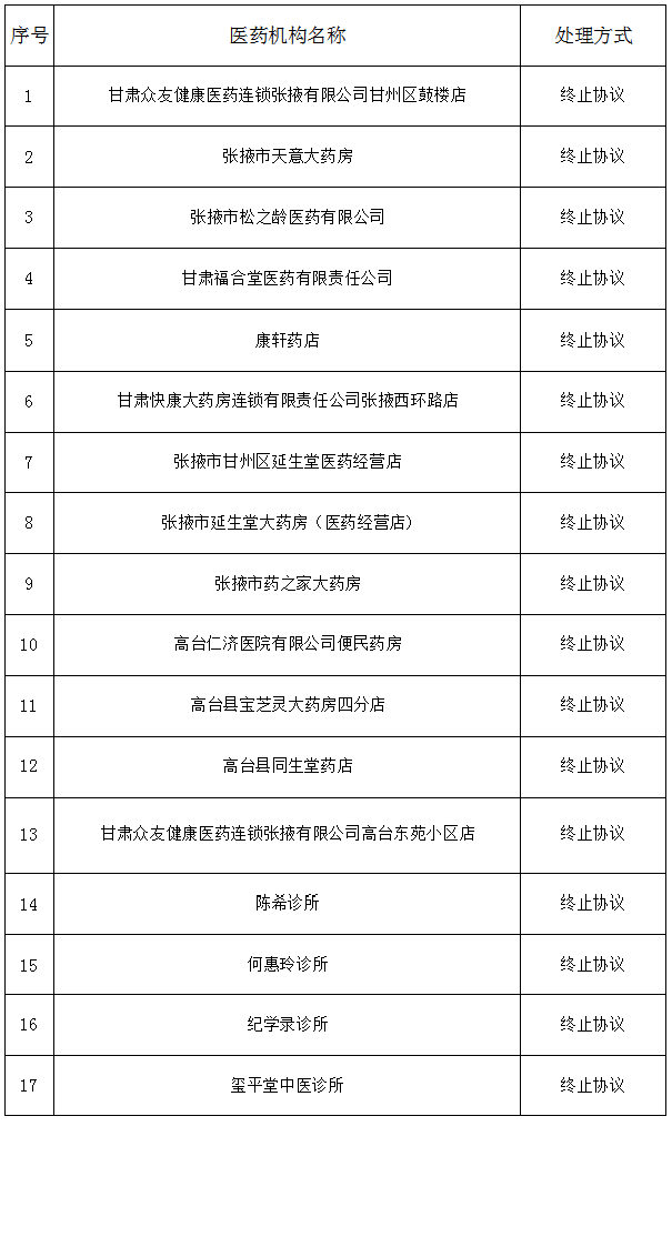 為全面加強和規范定點醫藥機構管理,保障醫?;鸢踩\行,根據《醫療保障基金使用監督管理條例》《醫療機構醫療保障定點管理暫行辦法》《零售藥店醫療保障定點管理暫行辦法》等相關規定和《張掖市定點醫療機構醫療保障服務協議》(2024版)《張掖市定點零售藥店醫療保障服務協議》(2024版)相關約定,現將甘肅眾友健康醫藥連鎖張掖有限公司甘州區鼓樓店等35家定點醫藥機構終止和解除醫保服務協議,協議終止和解除后產生的醫藥費用,醫療保障基金不再結算,特此公告。