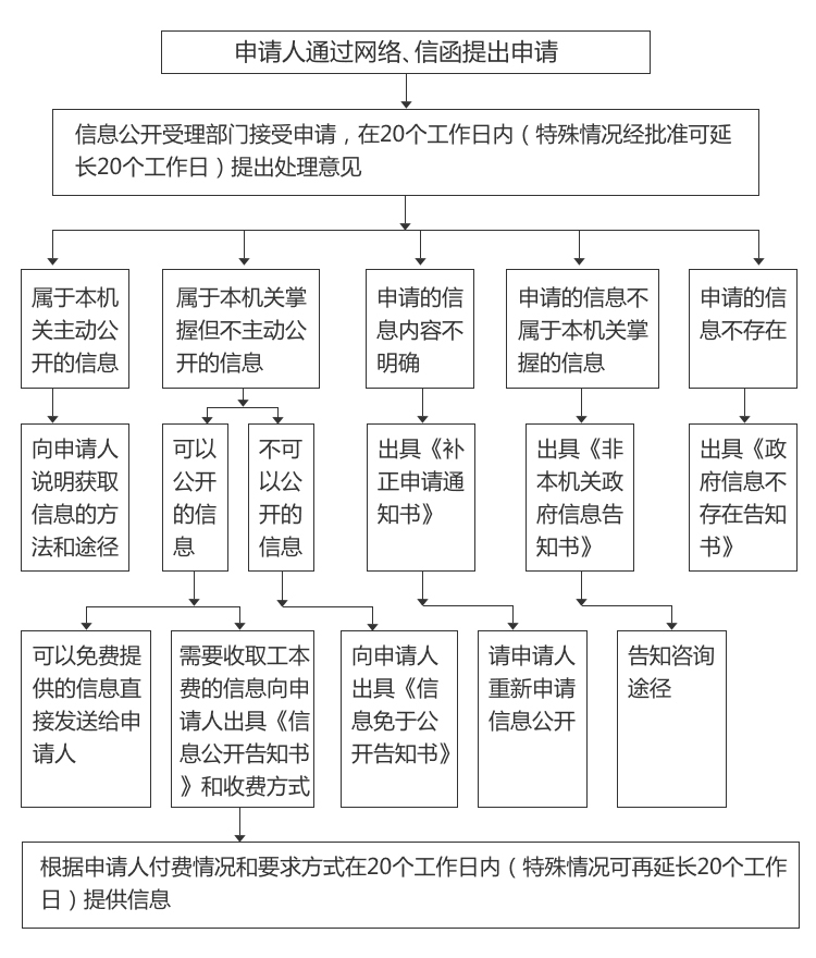 本機關收到公眾申請后,將進行登記和審核。經審核申請內容描述不明確,或者未按要求提供相應身份證明的,將自收到申請之日起7個工作日內一次性告知申請人作出補正,說明需要補正的事項和補正期限。申請人無正當理由逾期不補正的,視為放棄申請,行政機關不再處理該政府信息公開申請。經審核申請符合受理各項規定的,將根據以下情況進行辦理: