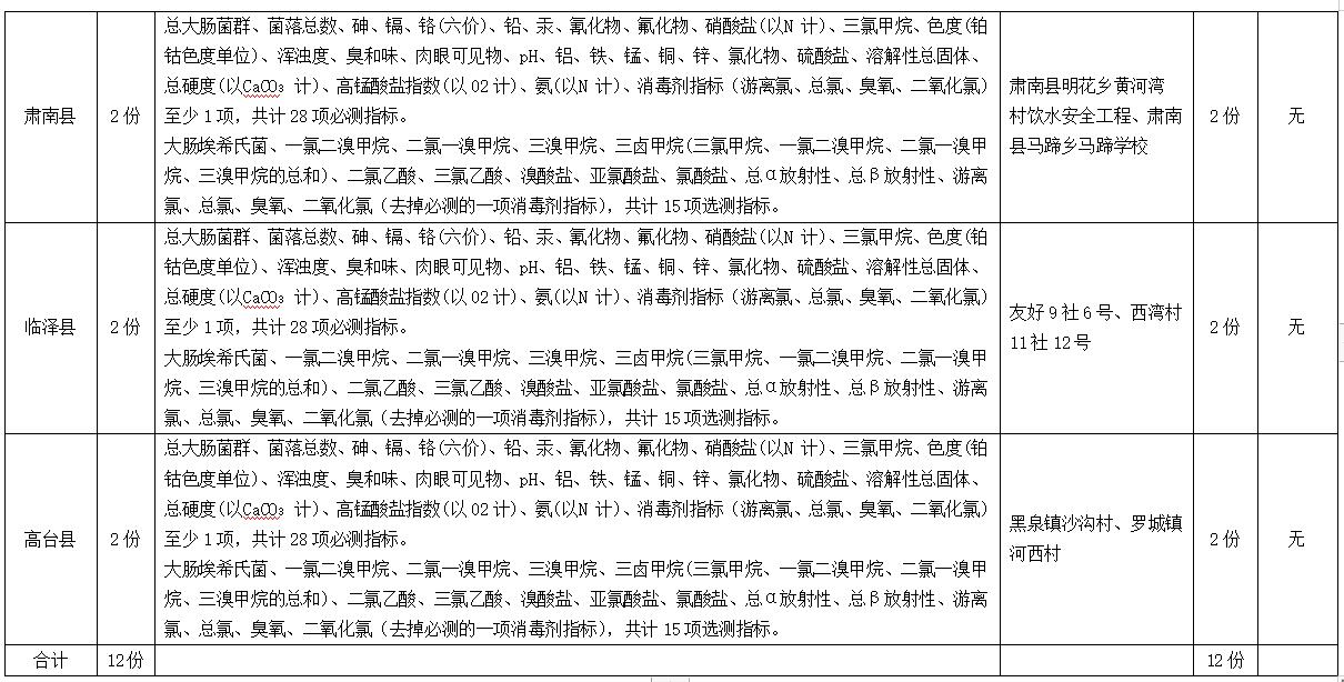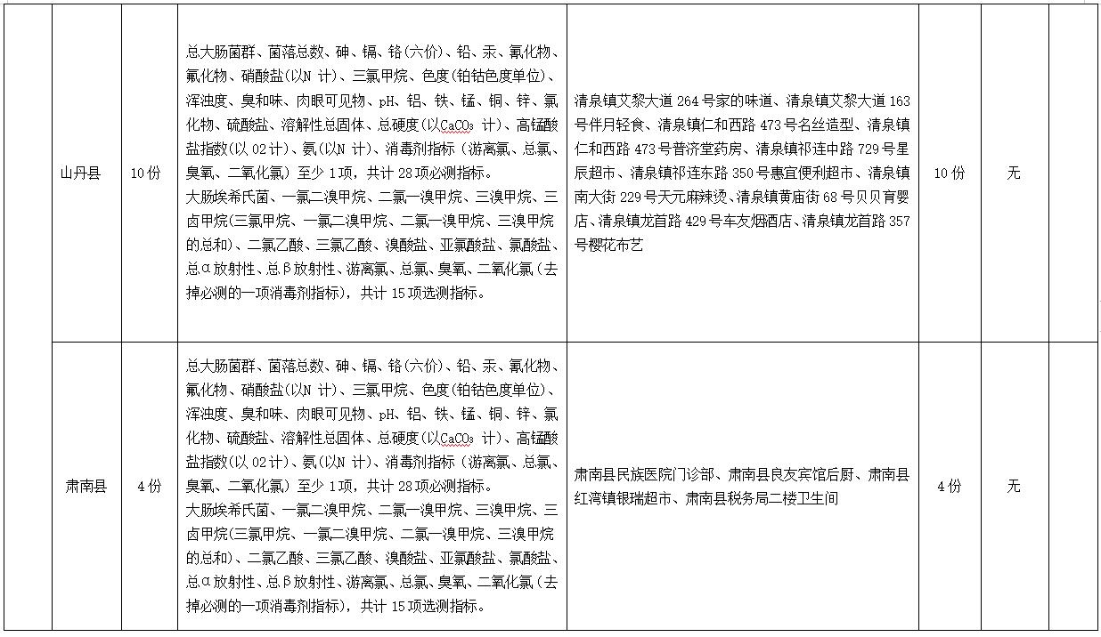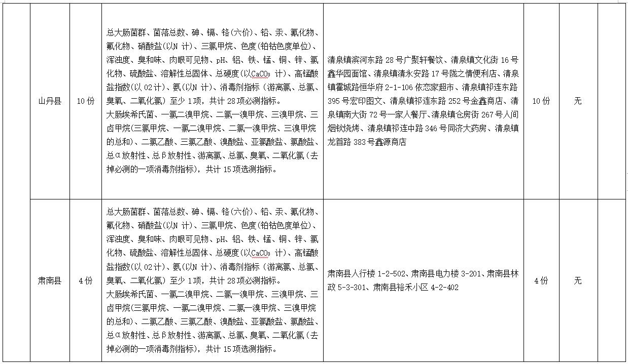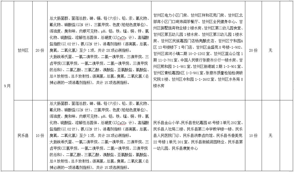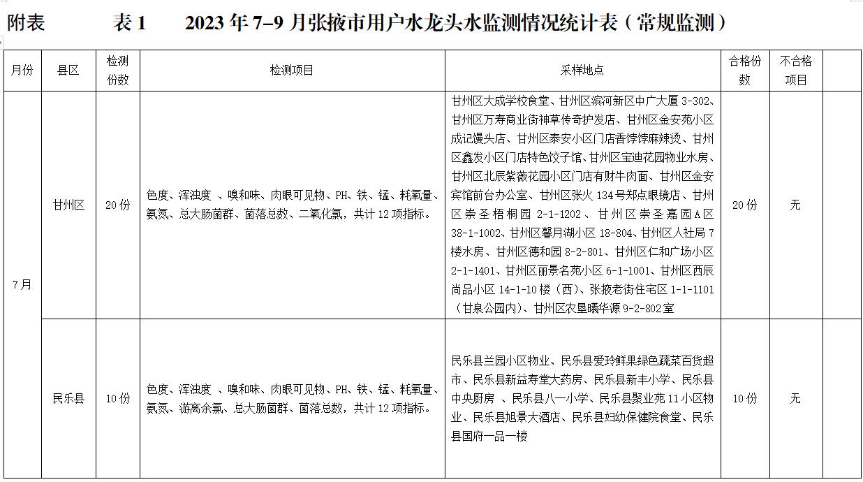 為全面掌握張掖市居民生活飲用水末梢水水質衛生情況,科學實施生活飲用水監測管理,保障人民群眾生活飲用水安全,根據《張掖市水污染防治工作實施方案》要求,市衛生健康委開展了2023年第三季度用戶水龍頭水水質監測工作,現將監測結果公示如下:
