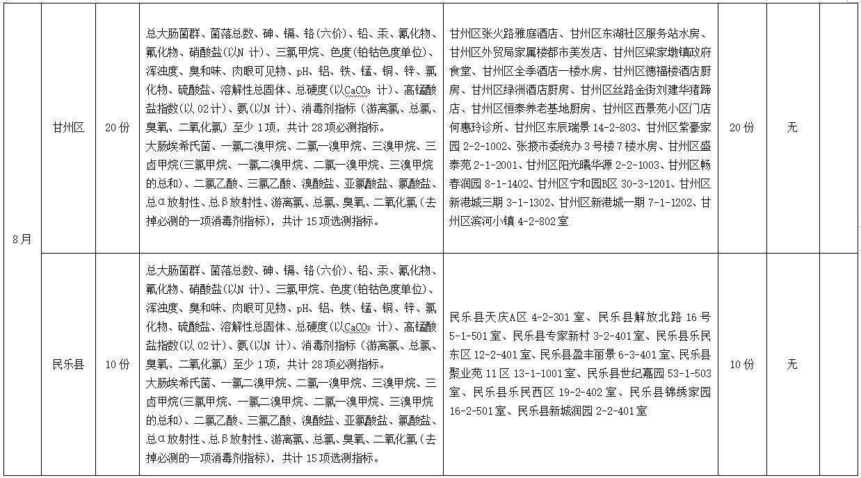 7-9月各縣區疾控中心(衛生監督所)采取隨機抽樣方法分別對轄區部分用戶水龍頭水進行了飲用水水質常規監測工作,甘州區檢測水樣60份,臨澤縣、民樂縣、山丹縣、高臺縣檢測水樣各30份,肅南縣檢測水樣12份,共檢測水樣192份。經檢測,所有水樣國家規定的檢測項目均合格。(見附表1)
