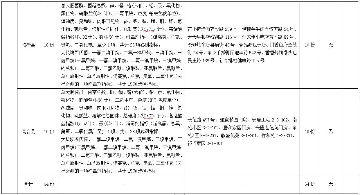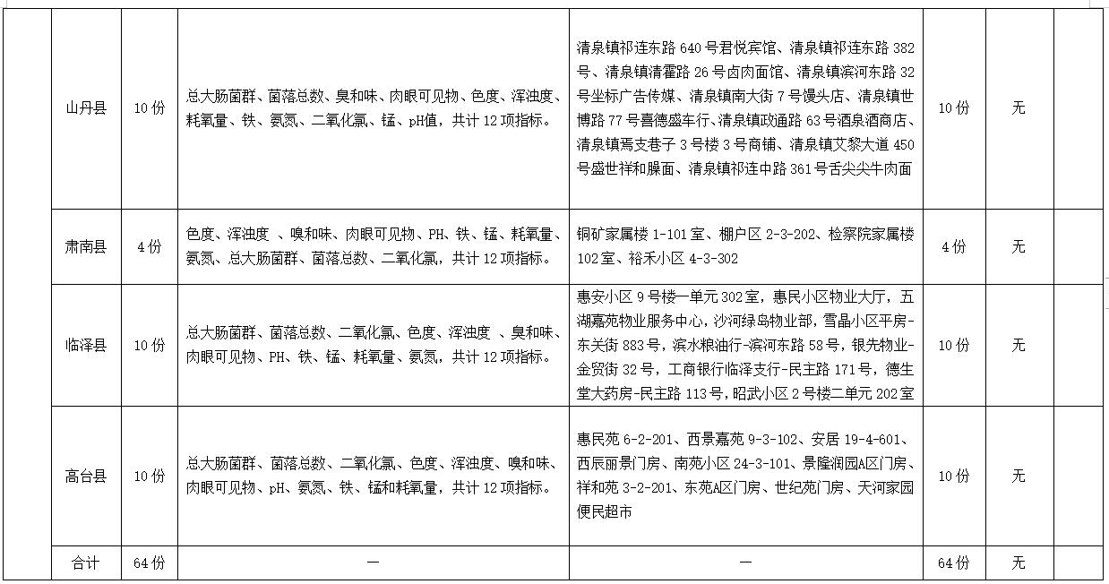 監測覆蓋6縣區城市供水和農村集中式供水,主要監測對象為各縣區城區和農村居民生活飲用水末梢水,即用戶水龍頭水。